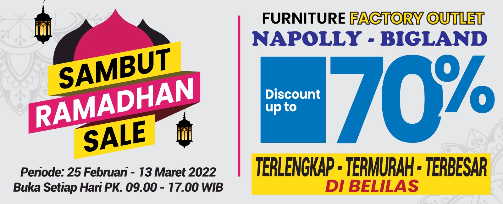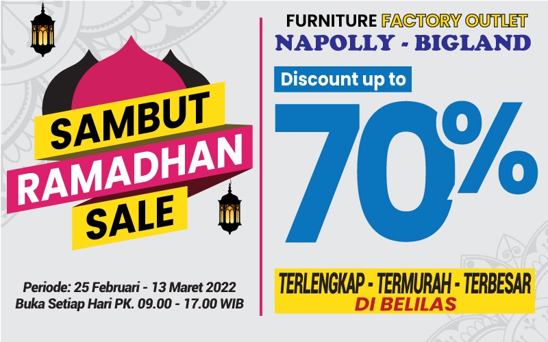 Persiapkan diri kalian untuk Sambut Ramadhan Sale Factory Outlet Napolly – Bigland akan hadir di tanggal 25 Februari – 13 Maret 2022 yang diskonnya sampai 70%. Catat waktu dan tempatnya