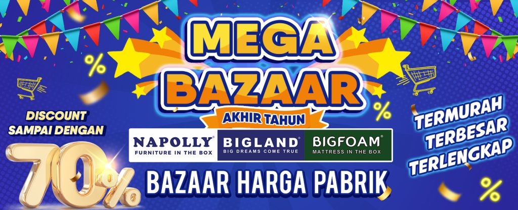 MEGA BAZAAR FURNITURE AKHIR TAHUN BIGLAND NAPOLLY BIGFOAM LEBIH BANYAK UNTUNGNYA, MAKIN SERU BONUSNYA Akhir Bulan November 2022, Bazaar Furniture Napolly Bigland Bigfoam hadir kembali dengan tema MEGA BAZAAR FURNITURE di beberapa kota seperti Musi Banyuasin – Palembang, Wonosobo, Karangayar, Bandung, Siak – Pekanbaru, Palu, Baturaja, Kediri, Musirawas – Lubuk Linggau, Tebo – Muara Bungo dan Bekasi. Napolly Bigland Bigfoam tidak hanya mengadakan bazaar di pabriknya tapi juga konsisten mengajak toko-toko furniture setempat untuk berkolaborasi dengan menyediakan tokonya sebagai lokasi bazaar. Tentu saja dengan harga pabrik yang termurah dan juga paling lengkap untuk memenuhi kebutuhan furniture di rumah kita. Selain itu, Bazaar juga hadir dengan memberikan paket-paket promo, bonus hadiah di beberapa produk barunya dan produk lainnya, serta undian berhadiah dengan total puluhan juta di akhir periode bazaar. Bazaar Furniture Napolly Bigland Bigfoam, selalu diminati masyarakat dan para penjual online karena memberikan kualitas produk langsung dari pabrik. Tidak sedikit reseller dan jastip, untuk memanfaatkan bazaar ini agar bisa mengambil keuntungan. Produk-produk furniture ini memang dijual kembali dengan harga normal, bahkan seringkali ditemui pembeli-pembeli biasa jadi jastip dadakan karena harga yang istimewa dan bonus-bonus belanja yang menggiurkan. Diskon yang mencapai 70%, tidak hanya diperuntukan pada produk-produk umum saja tapi untuk beberapa tempat bazaar ini juga diberikan kepada produk-produk terbaru dengan jangka waktu dan jumlah pembelian tertentu. Kegiatan bazaar furniture kali ini memang, menawarkan keuntungan berkali-kali lipat, dan dijamin murah. Ayo segera datang untuk raih keuntungan dari belanja murah di Mega Bazaar Furniture Akhir tahun Napolly Bigland Bigfoam di kota anda.