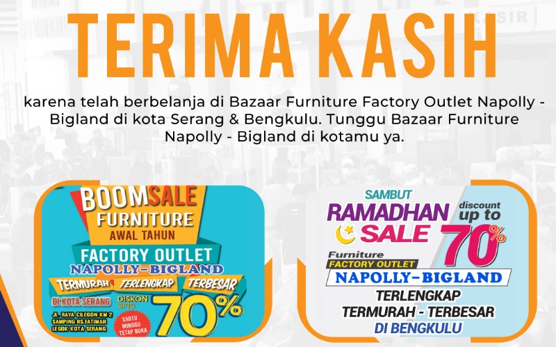 Terima Kasih karena telah berbelanja dan memeriahkan Bazaar Furniture Factory Outlet Napolly – Bigland Terlengkap Termurah Terbesar di kota Serang & Bengkulu.